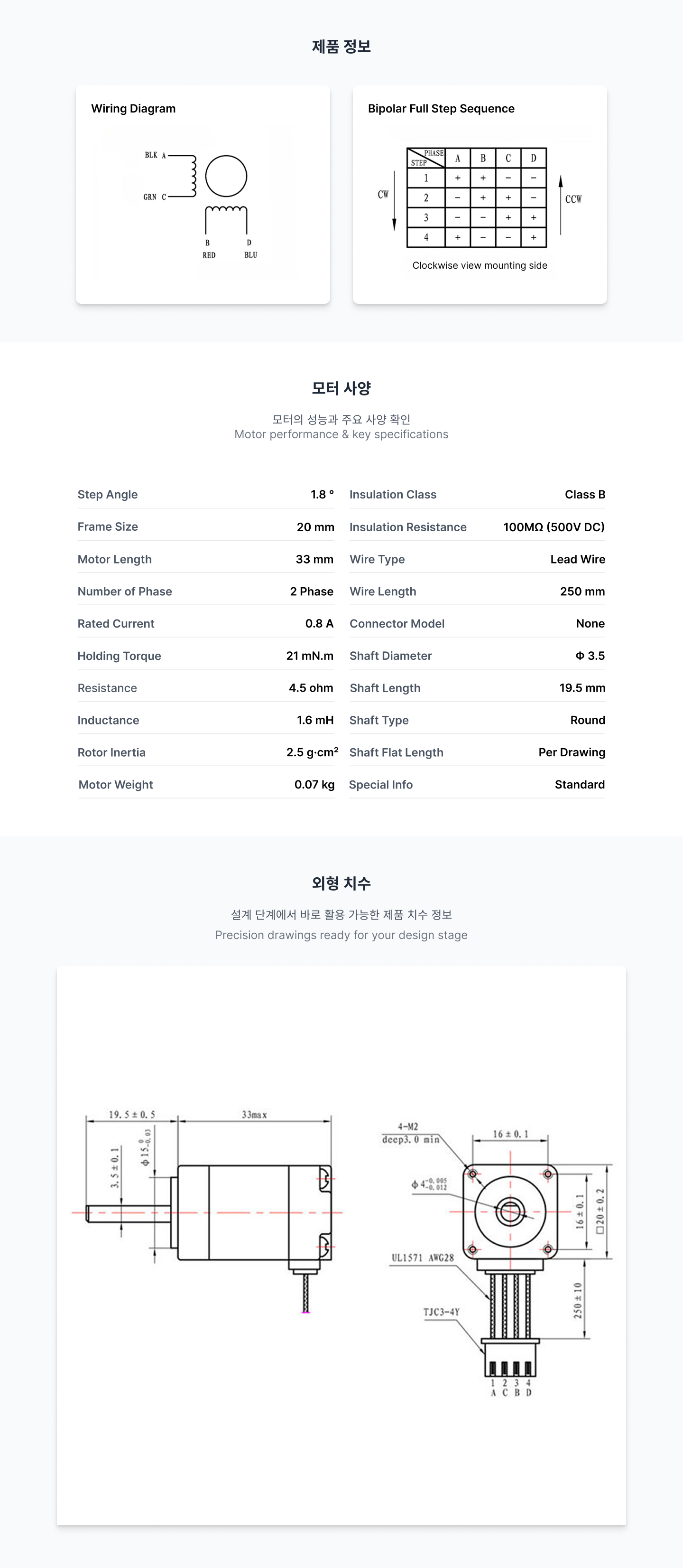 [20SJM0501-10] 20 mN·m 20×20×33 mm 미니어처 스텝모터 20SJM0501-10