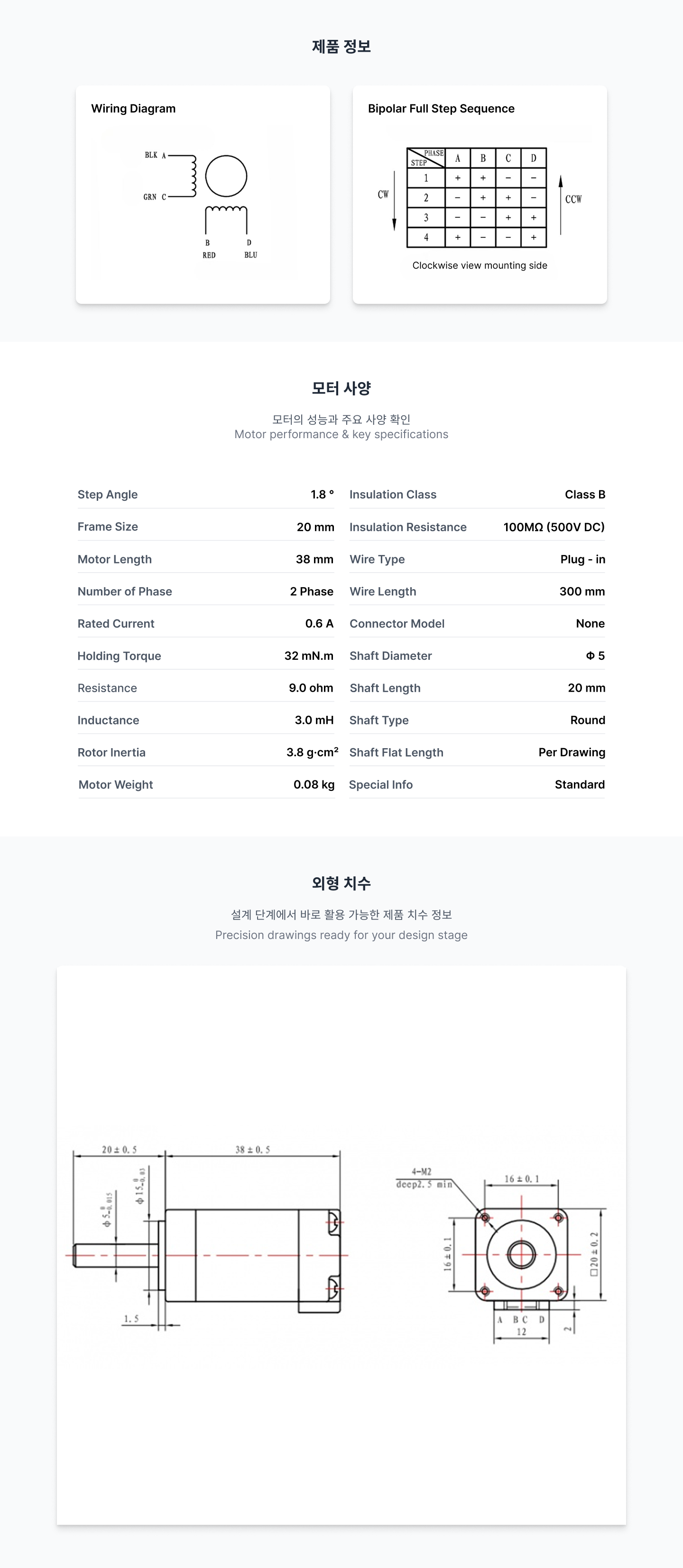 [20SJM0250-20] 32 mN·m 20×20×38 mm 미니어처 스텝모터 20SJM0250-20